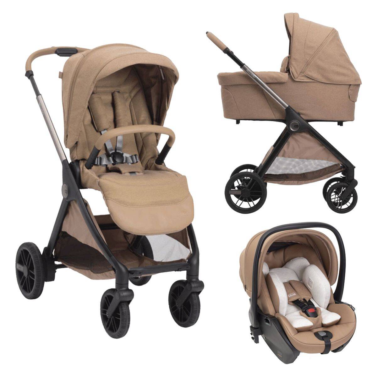 V paket so vključeni košara za novorojenčka, avtosedež, adapterji za avtosedež in dežna prevleka.