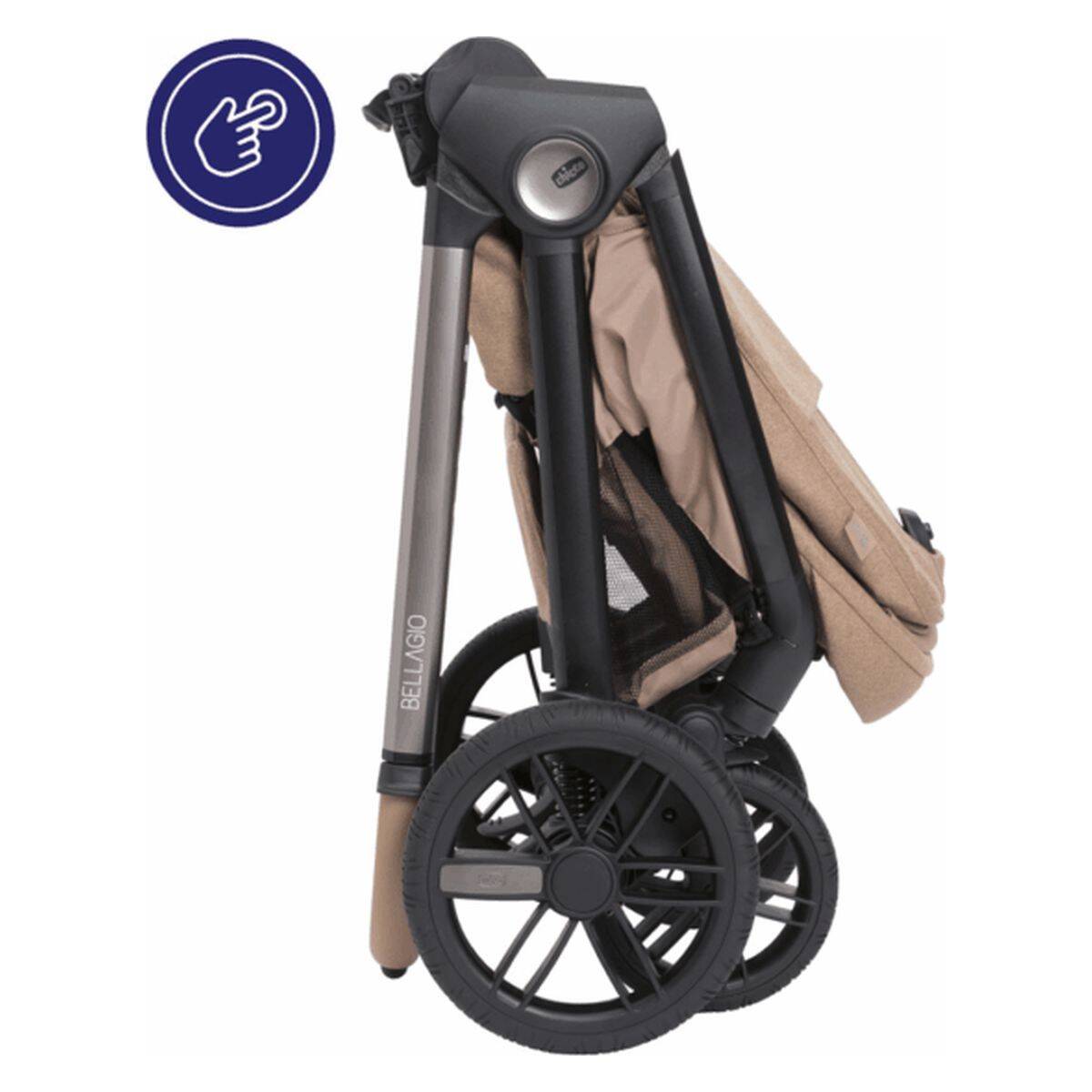 Zahvaljujoč revolucionarnemu sistemu zlaganja »OneTouch« je Bellagio ena najbolj praktičnih rešitev za sprehajanje vašega dojenčka. Vsako interakcijo z vozičkom je mogoče opraviti z eno samo roko – od zlaganja OneTouch do upravljanja naslona in opore za noge.