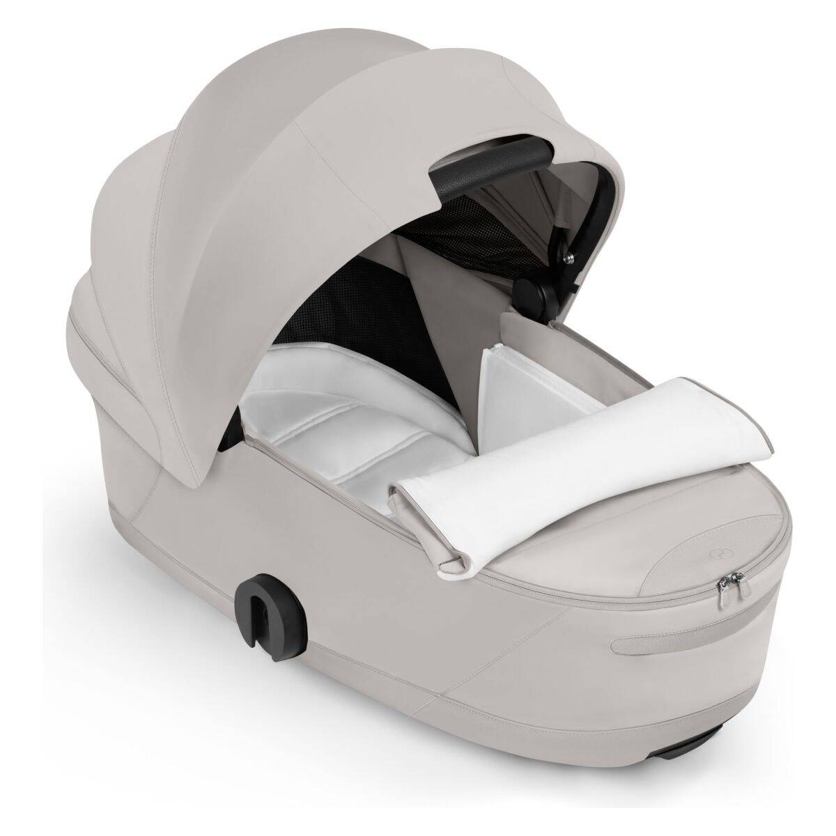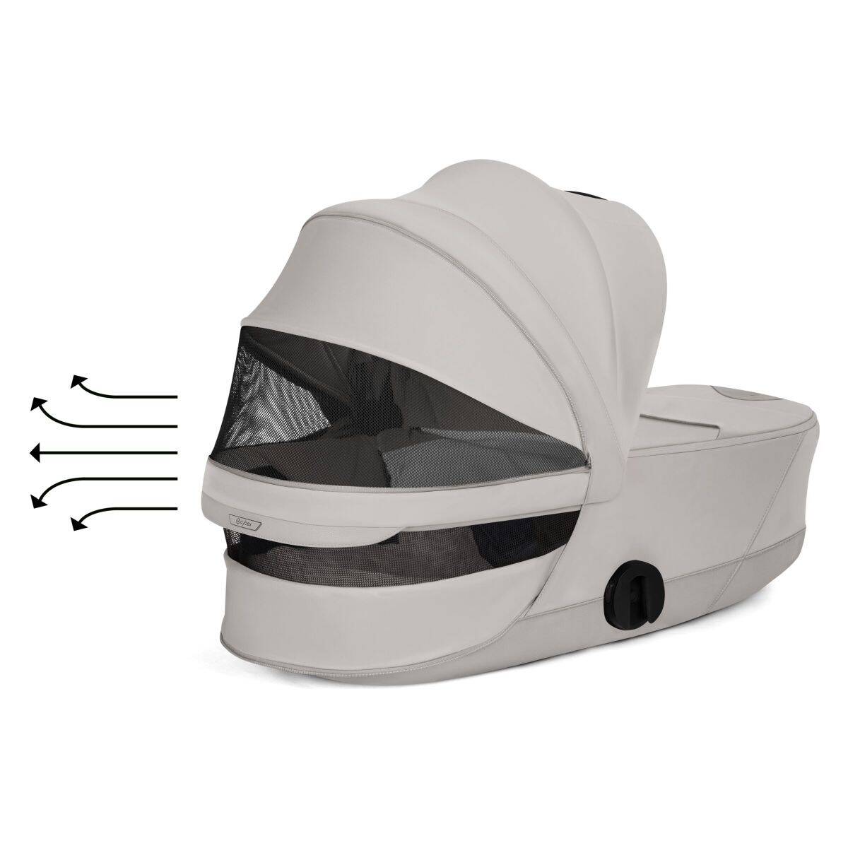 V notranjosti se nahaja zračna, ergonomska penasta vzmetnica, ki skupaj z dodatnimi prezračevalnimi odprtinami v dnu košare zagotavlja optimalno kroženje zraka in prijetno temperaturo v vseh položajih spanja. Dve panoramski in sky-view okni omogočata dodatno zračenje in otroku ponujata pogled na okolico, ob zaprtju pa ustvarita mirno in zaščiteno okolje za počitek.