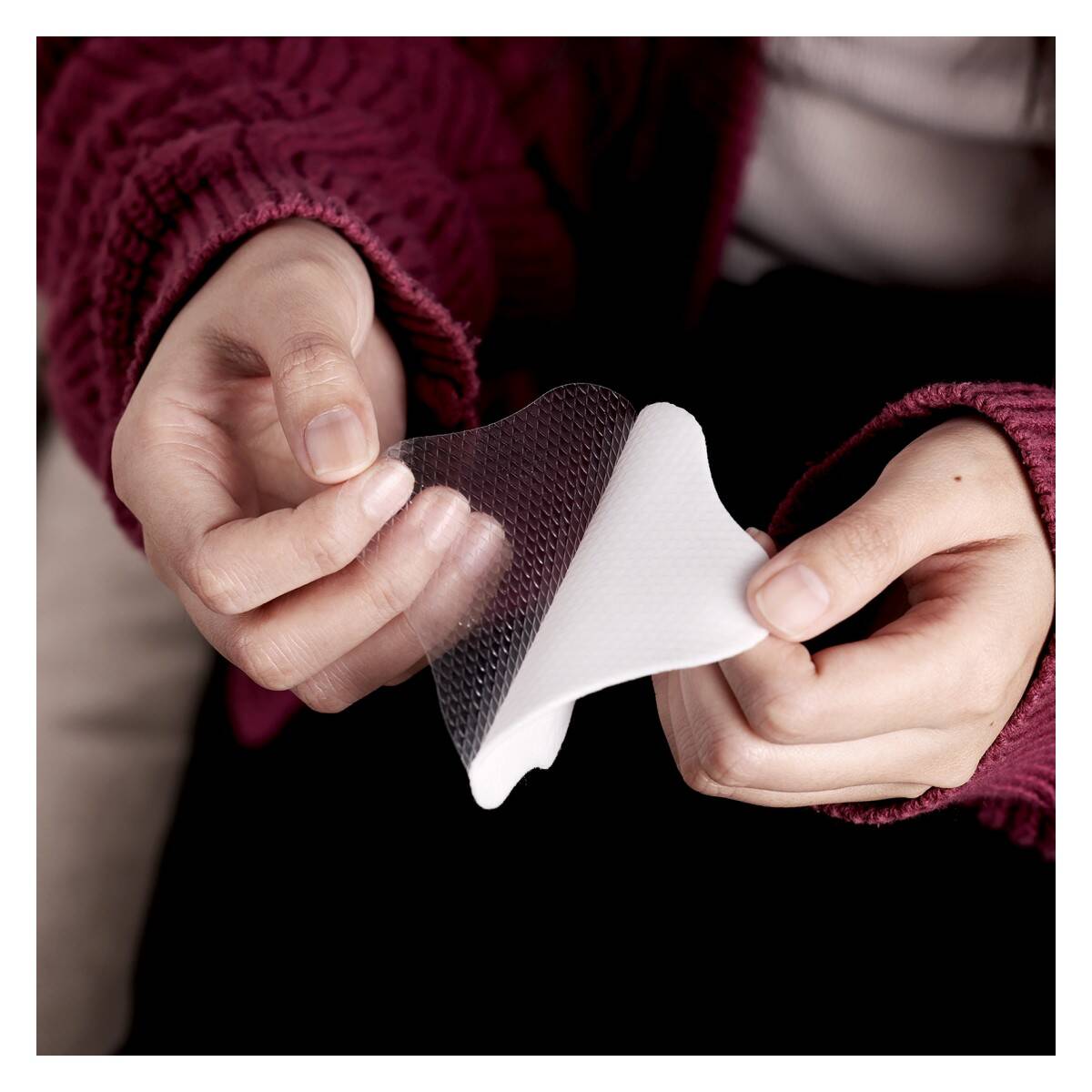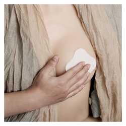 3. Hidrogelno stran komprese nežno namestite neposredno na bradavico, da je ta v celoti prekrita.