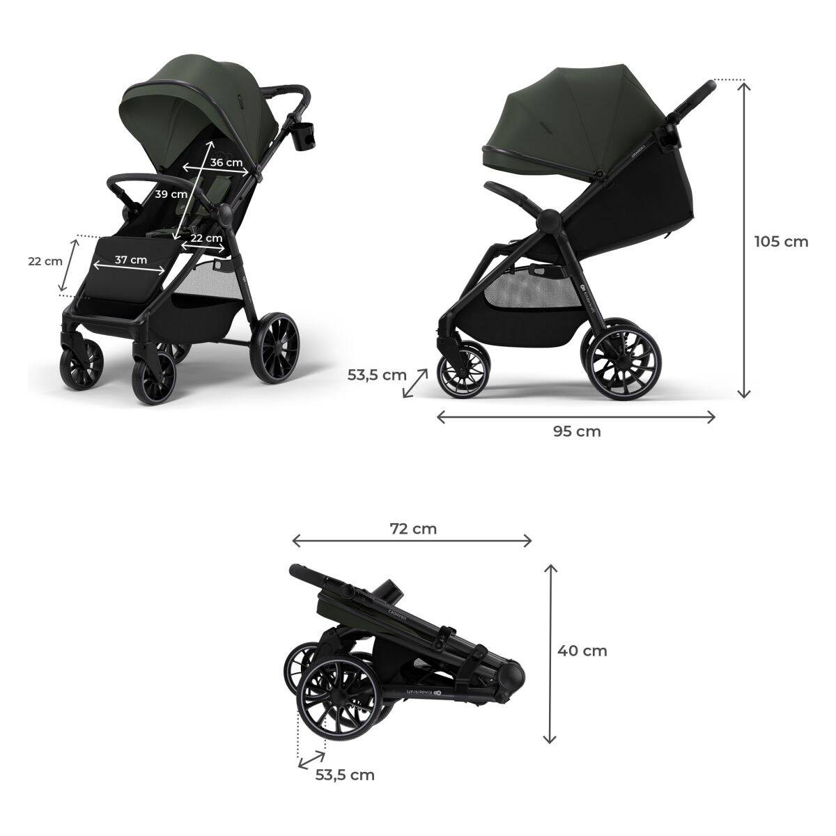Mere zloženega vozička: 72 × 53,5 × 40 cm.