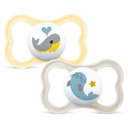 Večji ortodontski, simetrični cucelj iz SkinSoft™ silikona nudi naraven, mehak občutek pri sesanju, hkrati pa podpira pravilen razvoj zob in čeljusti pri starejših otrocih.