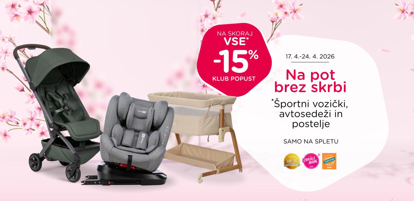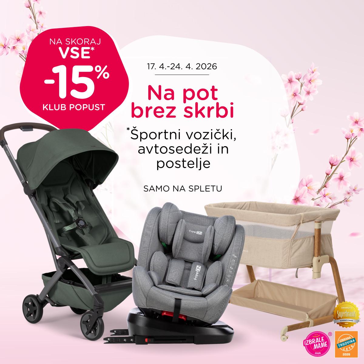 V času od 17. 4. do 24. 4. 2026 lahko samo na spletu nakupuješ športne vozičke, avtosedeže, postelje in prenosne postelje po rednih cenah kar 15 % ugodneje.