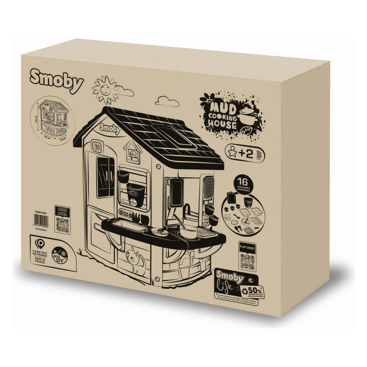 Smoby Life Mud Cooking hišica je čudovita hiška za igro na prostem, zasnovana za male ustvarjalce, ki obožujejo igro s peskom, vodo in naravnimi materiali. Hiška ima 2 polovična vrata iz pihane plastike, 2 okni s polkni ter poseben zunanji prostor za čofotanje in eksperimentiranje. Okno, ki gleda na delovno površino, lahko služi tudi kot servirna odprtina.