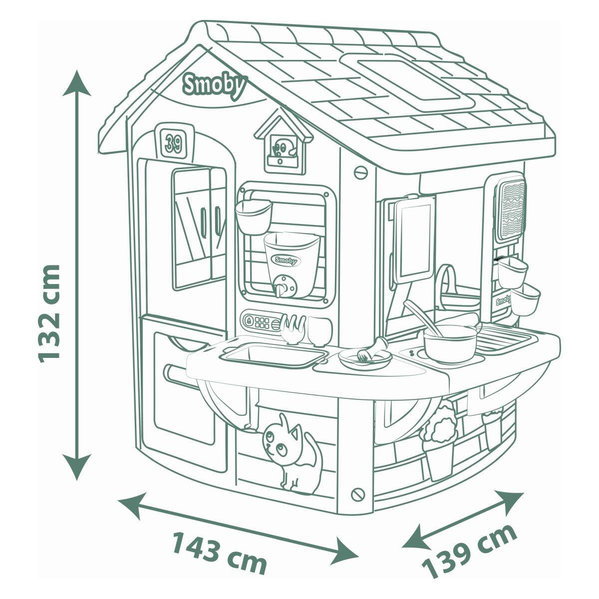 Hiška je videti kot prava otroška kuhinja v naravi – s polovičnimi vrati in polkni, ki jo naredijo še bolj realistično. Primerna je za otroke od 2. leta starosti naprej in bo zaradi kakovostnih materialov ter francoske izdelave služila več let zabave na vrtu.
