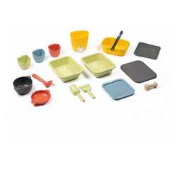 Paket vsebuje 16 dodatkov, med njimi: košaro, sito, ponev s pokrovko, zajemalko, tolkač, rezervoar za vodo z zajemalko, lopatko, grabljice, tablo za pisanje in še več! Dodatke lahko otroci obesijo na pripravljene letvice, da so vedno pri roki.