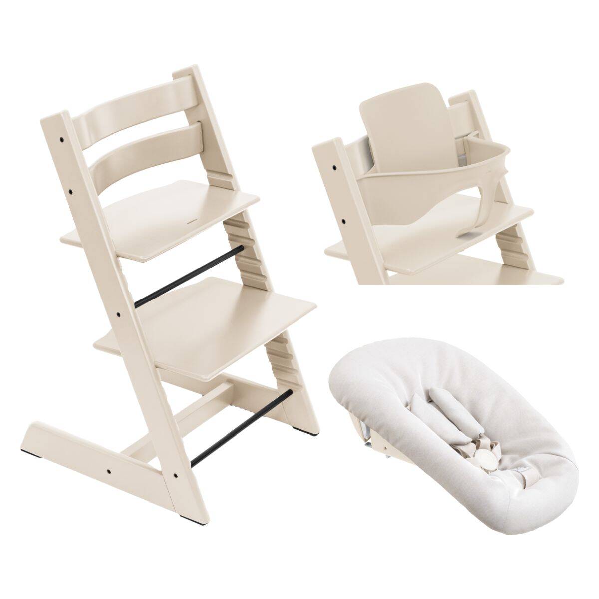 Tripp Trapp® Stol, ki raste z otrokom™ - stol + varovalo Baby Set² + set za dojenčka Tripp Trapp® Newborn Set je rešitev 3 v 1, s katero vašega novorojenčka popeljete k jedilni mizi in ga približate družini. Nato brezhibno preide na podporo pri sedenju od 6. meseca dalje z varovalom, Baby Set².