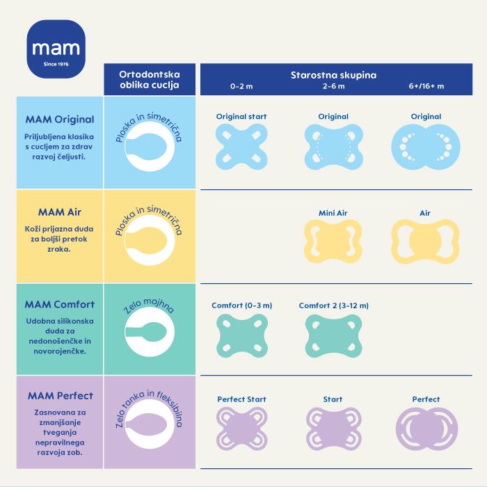 MAM je evropska blagovna znamka z več kot 50-letno tradicijo razvoja izdelkov za dojenčke in malčke v sodelovanju z zdravstvenimi strokovnjaki. Izdelki MAM so zasnovani na podlagi znanstvenih raziskav in kliničnih testiranj.