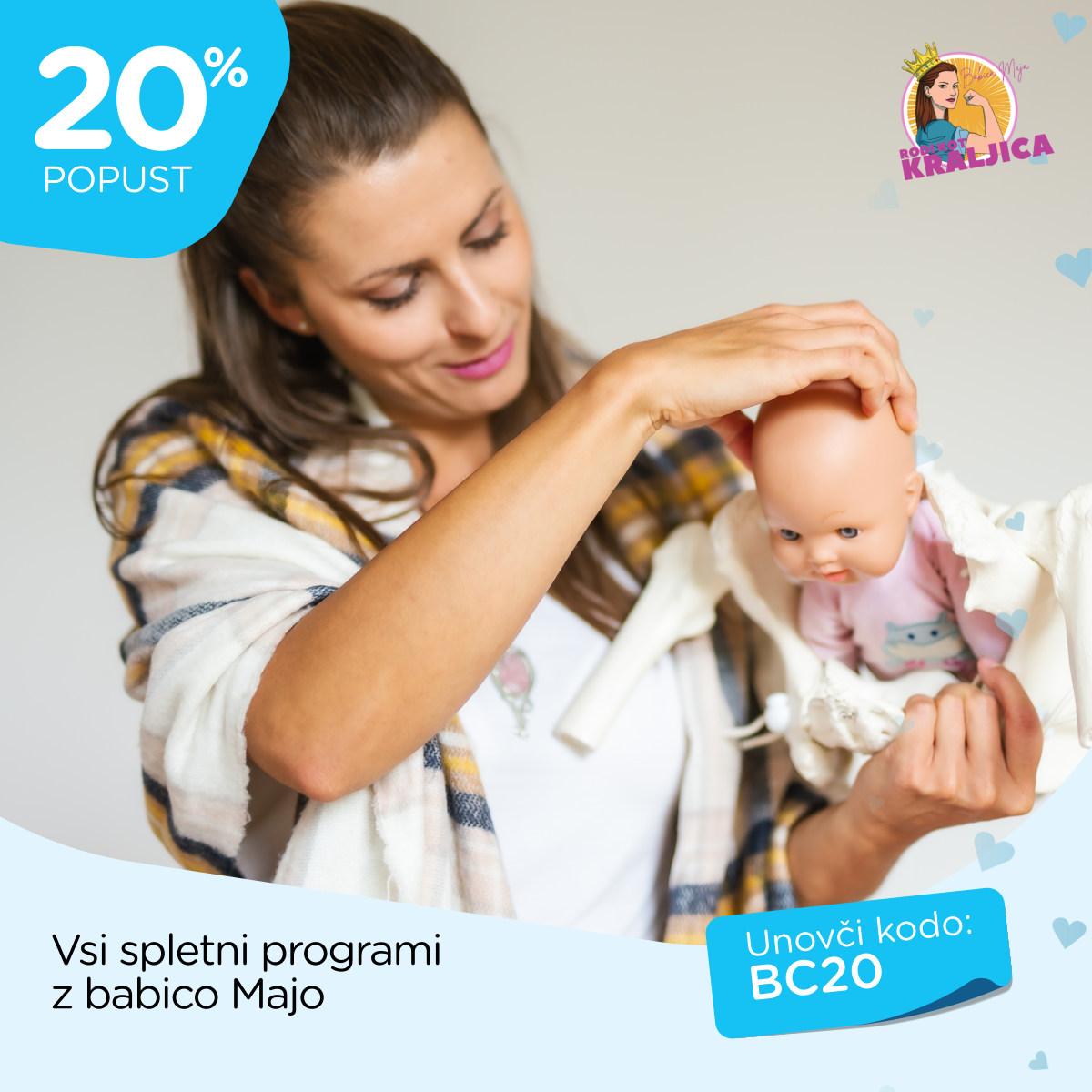 Kodo BC20 unovčite od 1. 3. 2025 do 31. 8. 2026 ob zakupu kateregakoli spletnega programa z babico Majo na www.babicamaja.com. Kuponi niso združljivi, popusti se ne seštevajo.