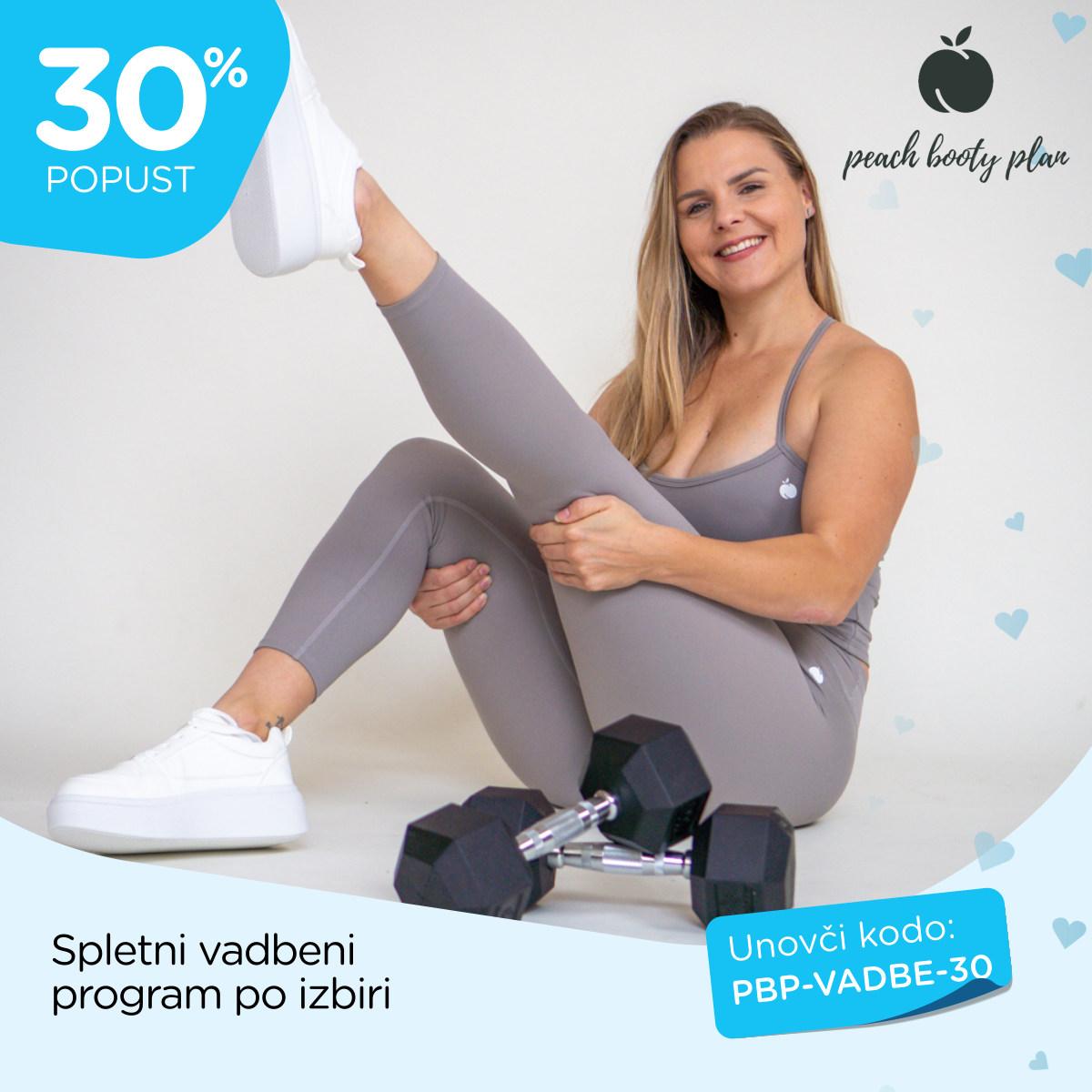 Kodo PBP-VADBE-30 unovčite od 1. 3. 2025 do 31. 8. 2026 ob zakupu katerega koli spletnega vadbenega programa Peach Booty Plan na www.peachbootyplan.com. Kuponi niso združljivi, popusti se ne seštevajo.